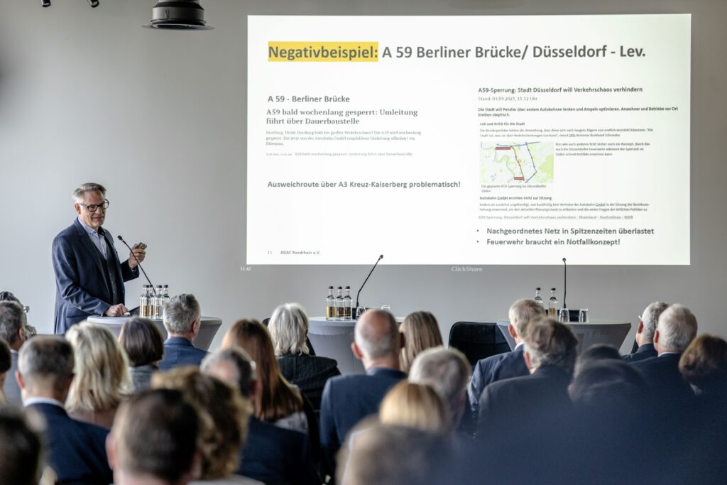 In seiner Keynote „Baustellen auf allen Wegen – Fluch oder Segen?“ analysierte Professor Roman Suthold vom ADAC Nordrhein die allgemeine Wahrnehmung von Baustellen. Während sie kurzfristig für Staus und Umwege sorgen, seien sie langfristig unverzichtbar für eine leistungsfähige Infrastruktur. Der Wissenschaftler plädiert unter anderem für eine Anlaufstelle für Betroffene vor Ort, die tagesaktuell informiert: „Wenn Menschen verstehen, warum gebaut wird und wie lange es dauert, steigt die Akzeptanz.“ Um die Vorhaben besser zu synchronisieren, könne auch eine Landesplanungsgesellschaft NRW eingerichtet werden.