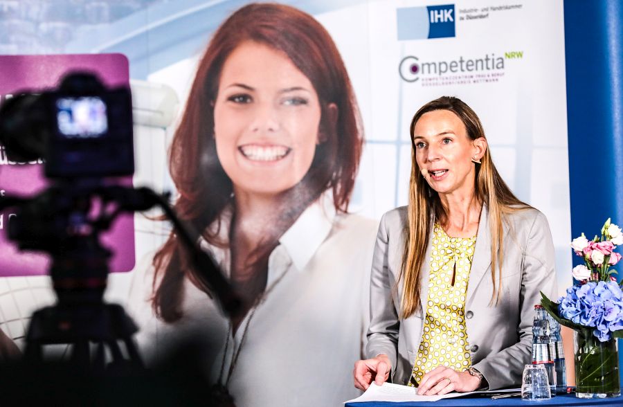 Alles ist anders in diesem Jahr. Das galt auch für das Frauen-Wirtschaftsforum women2Business am 2. September, zu dem die Industrie- und Handelskammer Düsseldorf und das Kompetenzzentrum Frau und Beruf Düsseldorf und Kreis Mettmann zum achten Mal in die IHK lud. Statt voller Sitzreihen standen im Ernst-Schneider-Saal Kameras und Scheinwerfer für die Übertragung der Vorträge und Gesprächsrunden. An der Zahl der Teilnehmerinnen änderte das veränderte Setting allerdings kaum etwas. Wieder hörten und sahen rund 100 interessierte Frauen in Führungspositionen und solche, die es einmal werden möchten, zu.