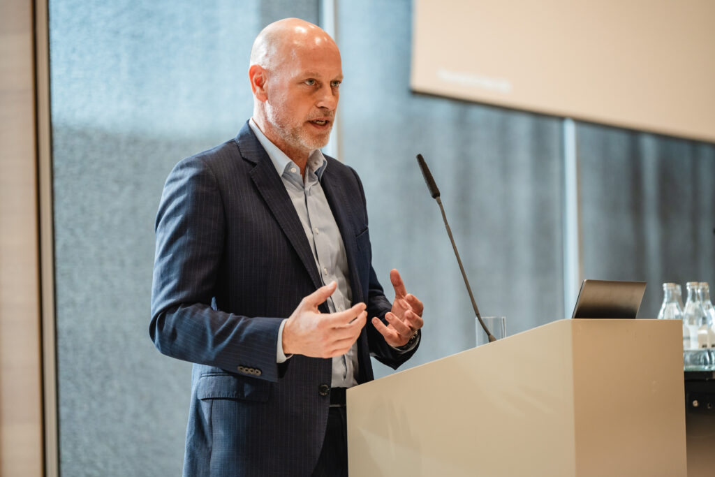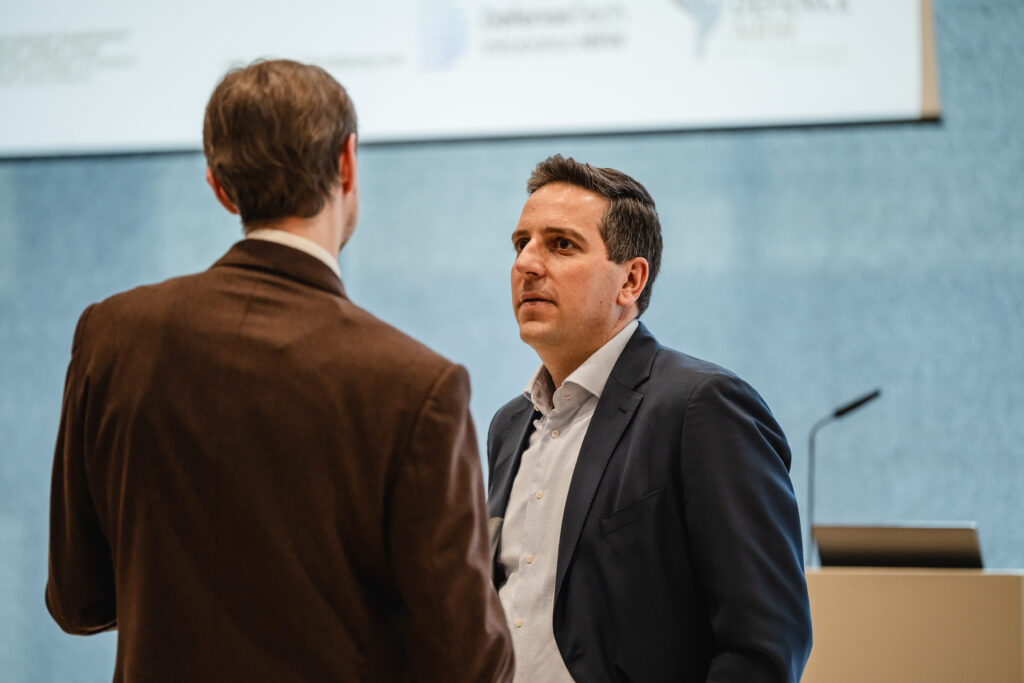 Zum Schluss spricht Dr. Christian Steinborn, Leiter Geschäftsentwicklung – Start-up-Aktivitäten bei der Rheinmetall AG. Er beschreibt einen gesellschaftlichen Wandel. „Verantwortungsvolle Verteidigung ist gefragt.“ Die Herausforderung liege in der Lieferung: Waffensysteme entstehen nicht auf Vorrat, Produktionslinien müssen sich schnell anpassen. Was ihm wichtig ist: „Wir verbinden die Stärke großer Unternehmen mit derjenigen von Start-ups.“ Die einen bringen robuste Systeme und Möglichkeiten zur Skalierung, die anderen frische Ideen und unkonventionelles Denken.