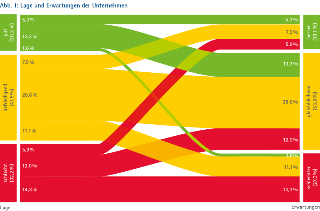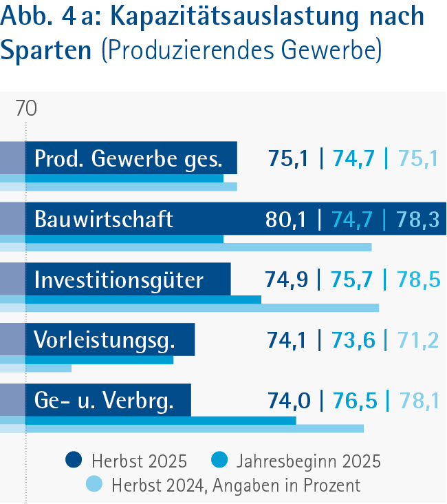 Die Industrierezession dauert an: Seit eineinhalb Jahren überwiegen negative Lageurteile deutlich. Besonders leiden exportorientierte Betriebe unter sinkender internationaler Wettbewerbsfähigkeit, geopolitischen Spannungen und Handelskonflikten. Energieintensive Branchen wie die Chemie melden eine nochmals verschlechterte Lage. Für die kommenden zwölf Monate rechnen mehr Industrieunternehmen mit Absatzrückgängen im In- und Ausland.