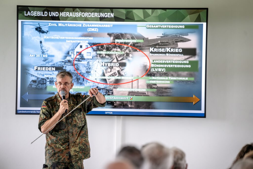 Oberst i.G. Dirk Franke vom Landeskommando NRW stellte die Rolle des „Operationsteams DEU“ als Teil der Gesamtverteidigung vor und ordnete die sicherheitspolitischen Rahmenbedingungen ein. Er machte deutlich, dass die Bundeswehr vor einem historischen Modernisierungsschub steht – sowohl bei der Ausrüstung als auch in der Kooperation mit der Wirtschaft.